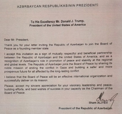 Присоединившись к "Совету мира", Азербайджанская Республика разделит его благородную миссию, направленную на завершение конфликта в Газе и создание более безопасного и благополучного будущего для всех сторон, пострадавших от многолетнего противостояния.