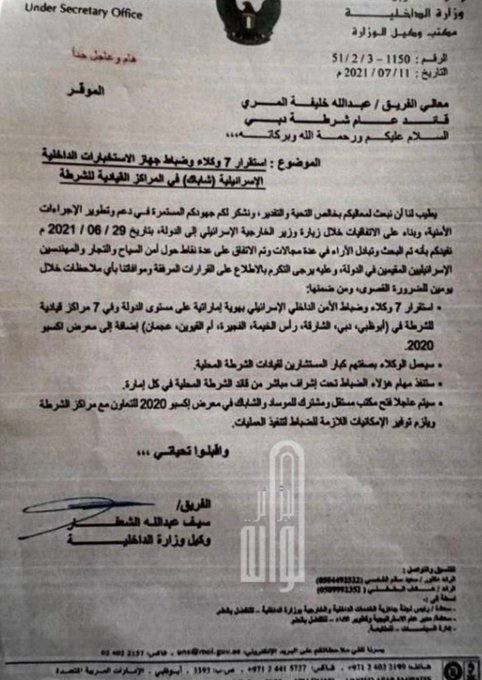Всплыл документ из министерства внутренних дел ОАЭ, который раскрывает секретное соглашение о внедрении семи агентов Шин Бет непосредственно в руководящие центры Абу-Даби, Дубая и всех семи эмиратов.