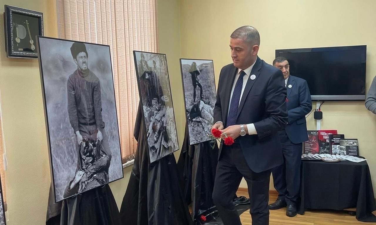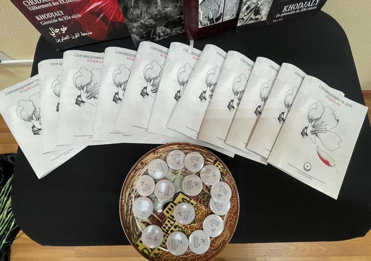 Участники церемонии возложили цветы к фотографиям жертв геноцида и ознакомились с информационными материалами «Справедливость для Ходжалы», подготовленными консульством.