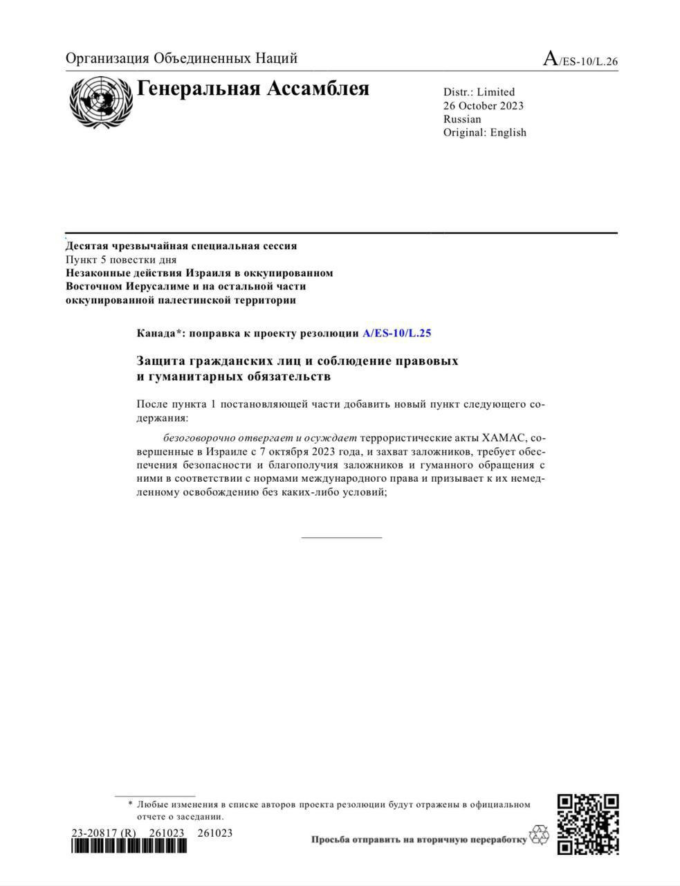 Как уже сообщалось ранее, Генеральная Ассамблея ООН 27 октября приняла резолюцию о ситуации в Газе.