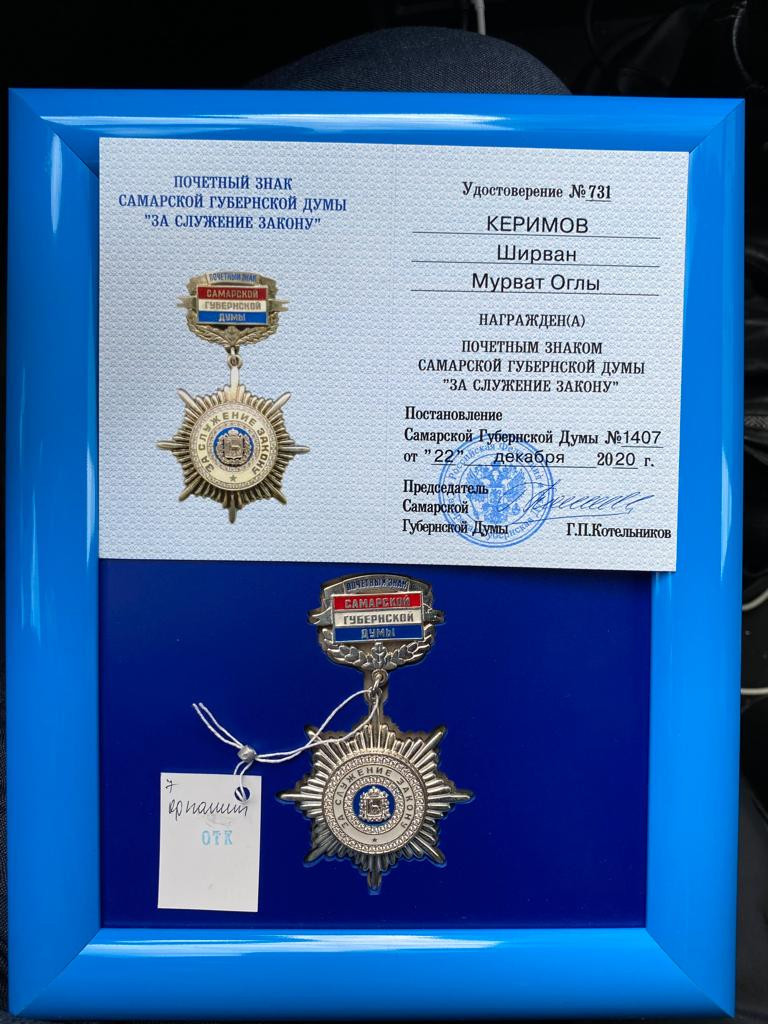 Как передает Vesti.Az, он был награжден почетной медалью Самарской Губернской Думы «На службе закона».