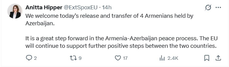 Как передает Vesti.az, об этом в соцсети X заявила официальный представитель Службы внешней политики и безопасности ЕС Анита Хиппер и спецпредставитель ЕС по Южному Кавказу и кризису в Грузии Магдалена Гроно.