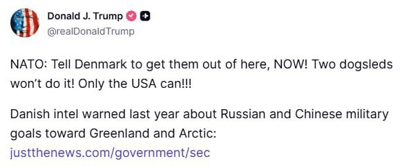 «НАТО: скажите Дании, чтобы они убирались отсюда немедленно! Двух собачьих упряжек недостаточно! Только США могут это сделать!» — написал глава Белого дома, прикрепив ссылку на публикацию о том, что в прошлом году датская разведка предупреждала о военных планах России и Китая в отношении Гренландии и Арктики.
