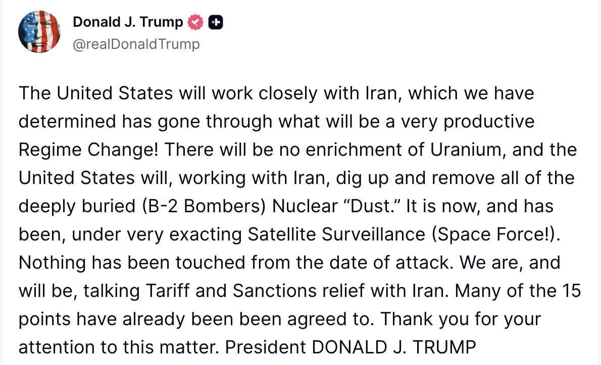 Дональд Трамп заявил в своей социальной сети, что Соединенные Штаты намерены тесно сотрудничать с Ираном, который, по его словам, прошел через «очень продуктивную смену режима».
