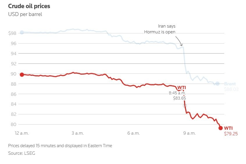 На мировых рынках зафиксировано резкое снижение цен на нефть после заявлений Ирана об открытии Ормузского пролива.