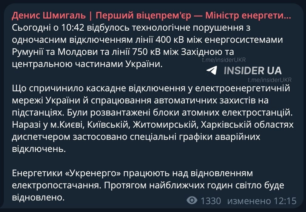 Премьер-министр Украины Денис Шмыгаль сообщил, что произошло технологическое нарушение с одновременным отключением линии электропередачи 400 кВ между энергосистемами Румыния и Молдова, а также линии 750 кВ между западной и центральной частями Украины. Это привело к каскадному отключению в украинской энергосети и срабатыванию автоматических защит на ряде подстанций.