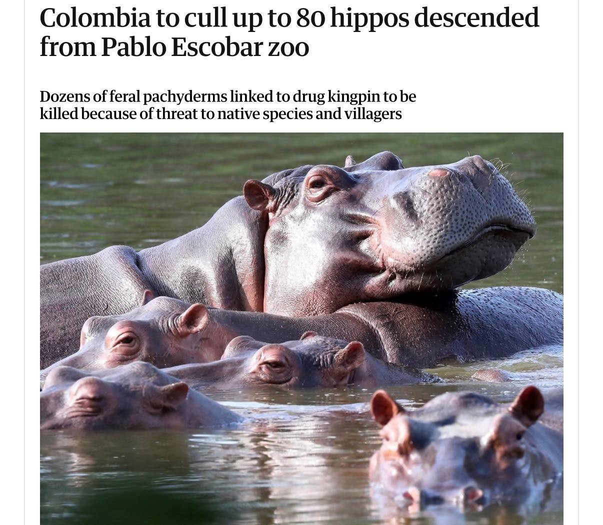 Власти рассматривают бегемотов как опасный инвазивный вид: по оценкам специалистов, они наносят ущерб экосистеме, вытесняют местную фауну и могут представлять угрозу для людей.