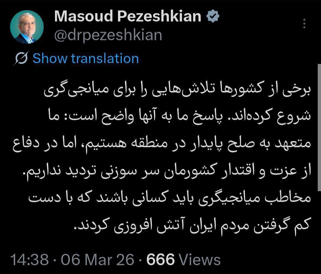 «Некоторые страны начали посреднические усилия. Давайте внесем ясность: мы привержены установлению прочного мира в регионе, но при этом без колебаний защищаем достоинство и суверенитет нашей страны», — заявил Пезешкиан.