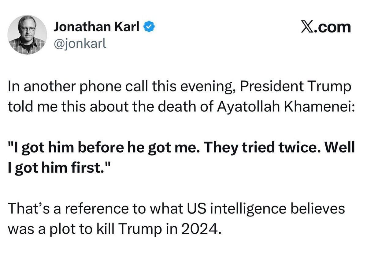 Однако эта версия расходится с публичными заявлениями президента США Дональд Трамп. В интервью журналисту Джонатан Карл Трамп заявил, что именно он несет ответственность за убийство Хаменеи.