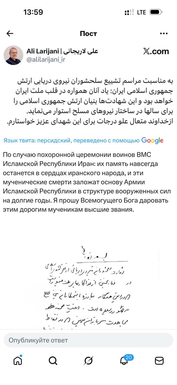Лариджани на фоне утверждений Израиля о его гибели опубликовал в соцсети X письмо с соболезнованиями в адрес погибших иранских моряков.