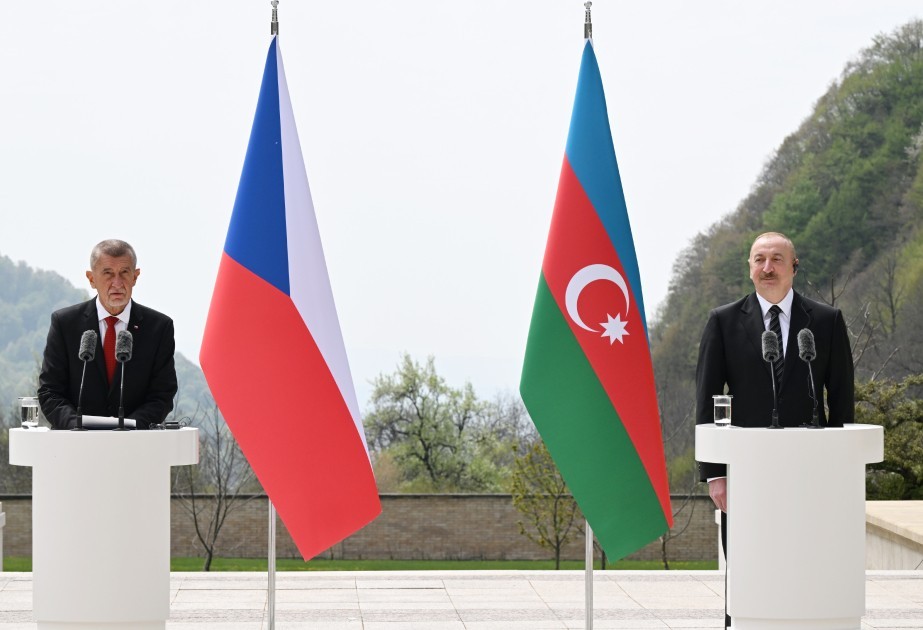 Ильхам Алиев и премьер-министр Чехии Андрей Бабиш выступают с заявлениями для СМИ.