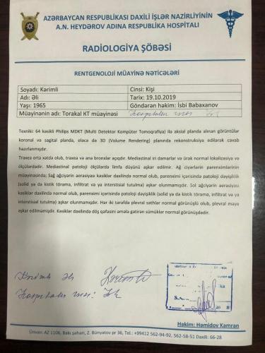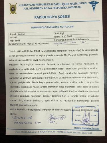 Касаясь заявлений Керимли, что он был доставлен в госпиталь на носилках, Бабаханов отметил, что пациент самостоятельно передвигался и без посторонней помощи прошел все обследования.