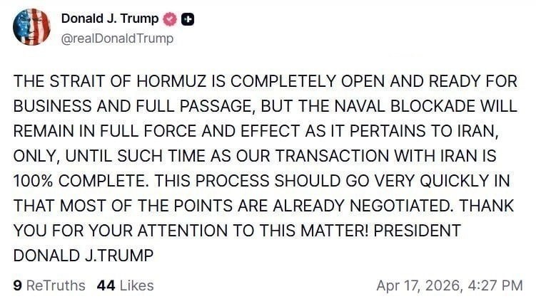 США сохранят морскую блокаду иранских портов, несмотря на открытие Ормузского пролива, заявил Дональд Трамп.