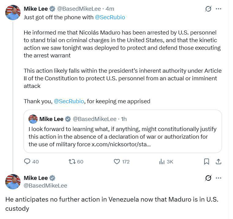 Об этом на платформе X сообщил сенатор Майк Ли со ссылкой на свой разговор с госсекретарем США Марко Рубио.