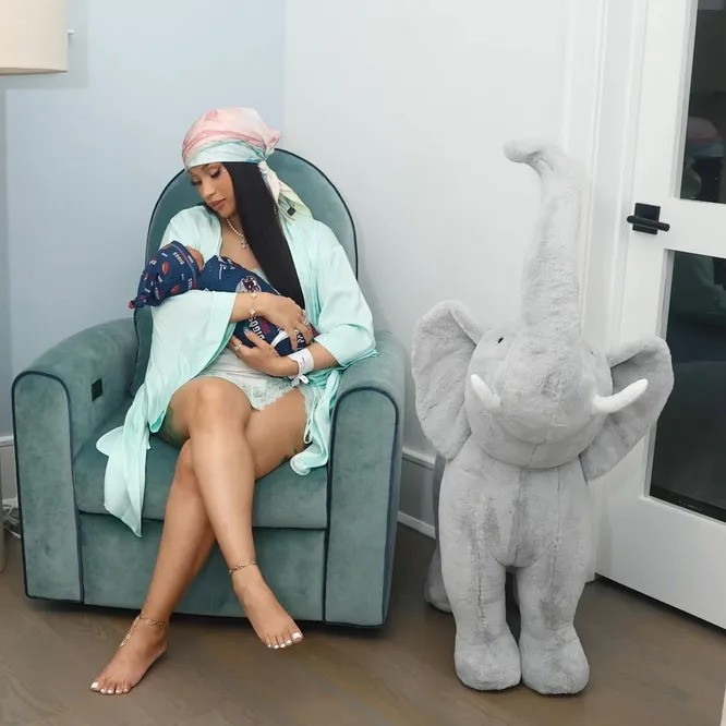 На фото Карди Би сидит в кресле в нежном пеньюаре, с шелковым платком на голове, создающим атмосферу домашнего спокойствия. Рядом огромный плюшевый слон, будто символ новой и трогательной главы в её жизни.