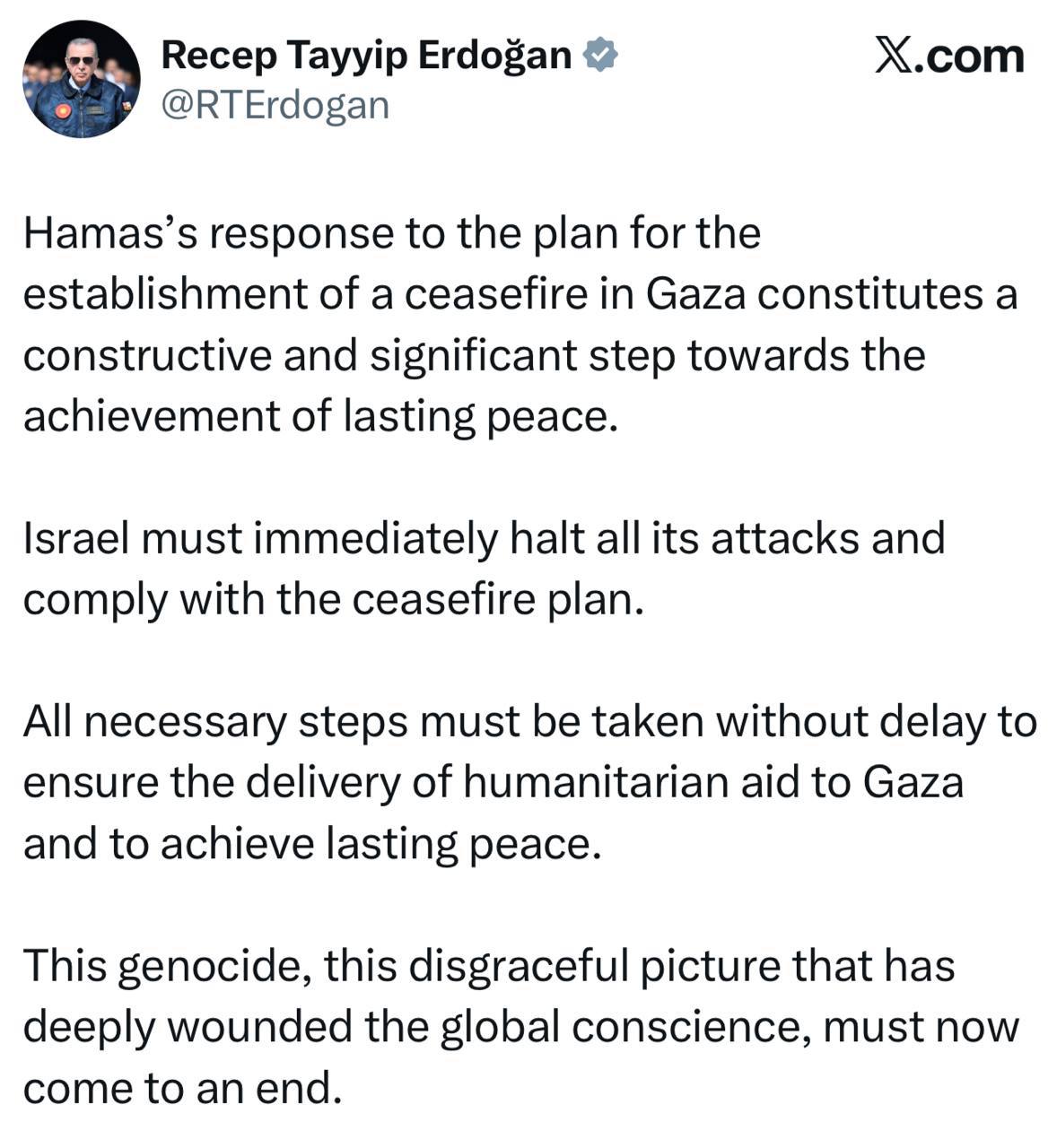 Президент Турции Реджеп Тайип Эрдоган положительно оценил реакцию движения ХАМАС на мирный план президента США Дональда Трампа по Газе, назвав её конструктивной.