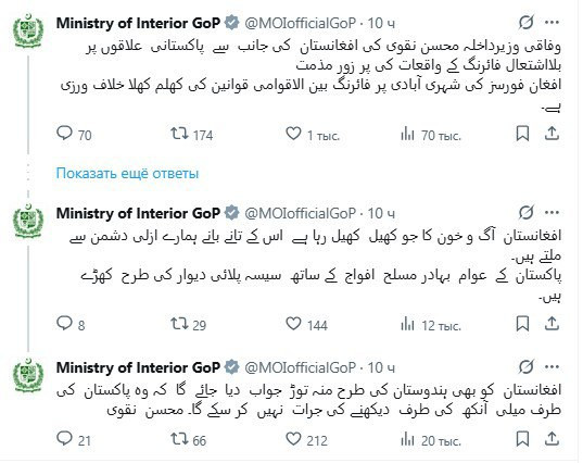 «Афганистан получит достойный ответ — как и Индия», — заявил министр внутренних дел Пакистана Мохсин Накви, комментируя ответные действия армии после обстрелов с афганской стороны.